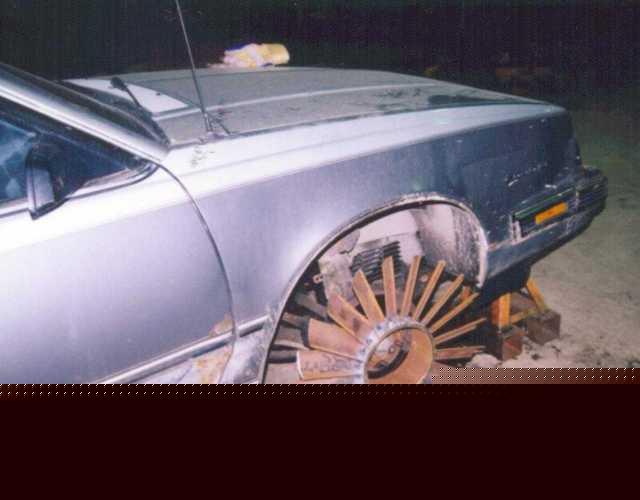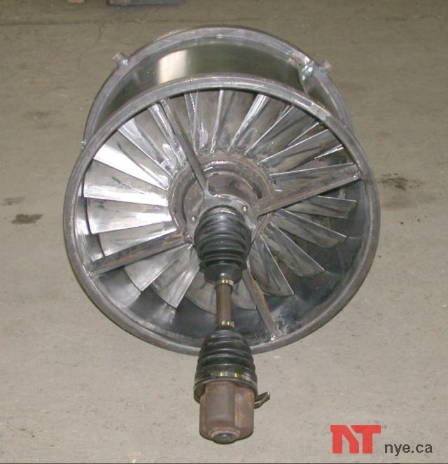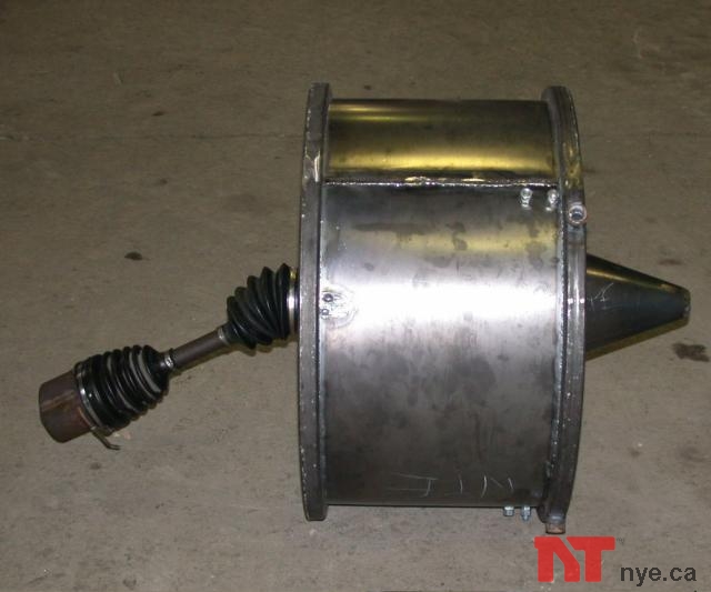 Here is the finished fan mounted on the Goolie axle. It blows like mad, but we can't get enough RPM at the spindle even in overdrive.